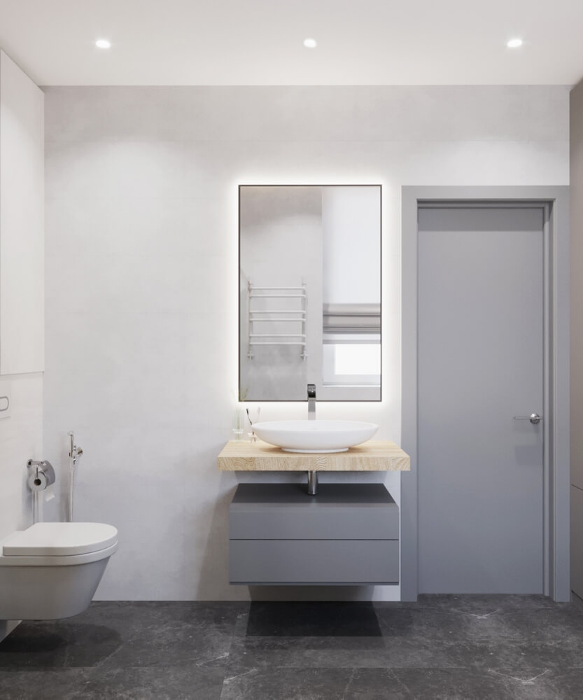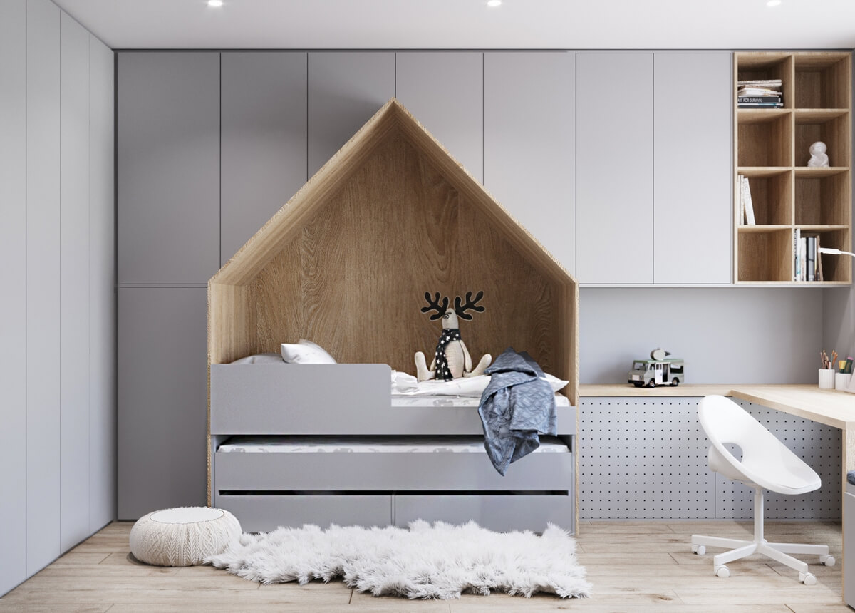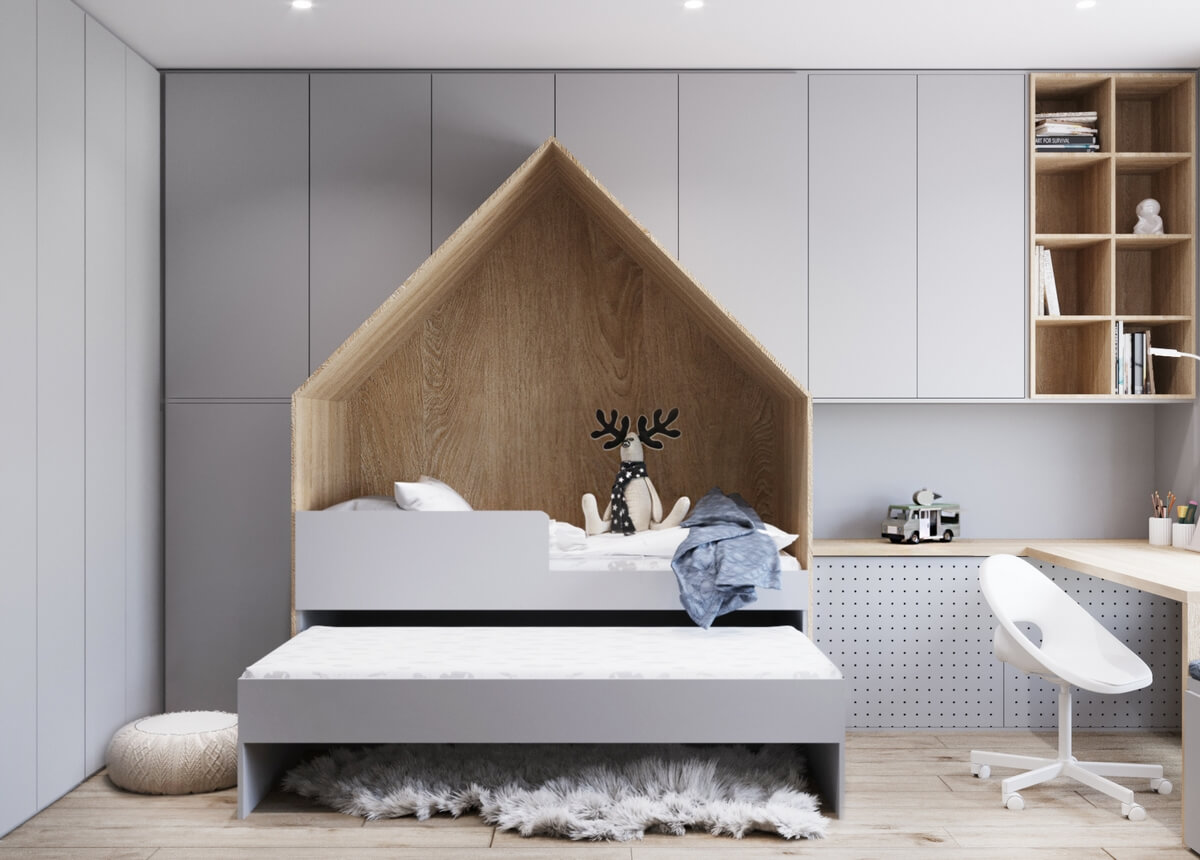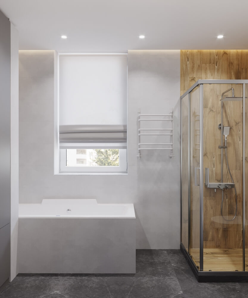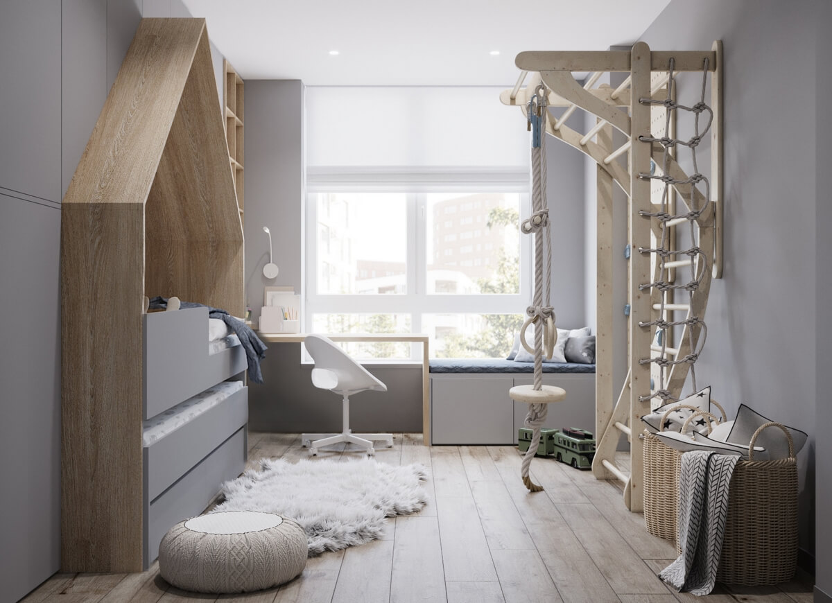 Невеликий передпокій оформлено у мінімалістичному стилі у сірих тонах, а для візуального розширення простору ми використали великі дзеркала. Кухня виконана у світлих тонах, а кухонних гарнітур – зі світлого необробленого дерева, що додає натуральності, природності інтер’єру і домашнього затишку. У дитячій кімнаті окремої уваги заслуговує ліжко, зроблене у ніші – таким чином дитина емоційно відчуває себе захищеною, а у кімнаті з’являється додаткове місце для зберігання речей. У дитячій кімнаті окрім зони для сну передбачено робочий куточок, де дитина зможе займатись навчанням, та ігрова. Також дерев’яні елементи використані у ванній кімнаті, це актуальний тренд сьогодні.