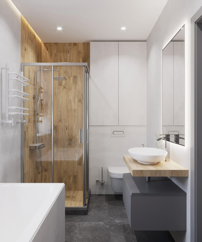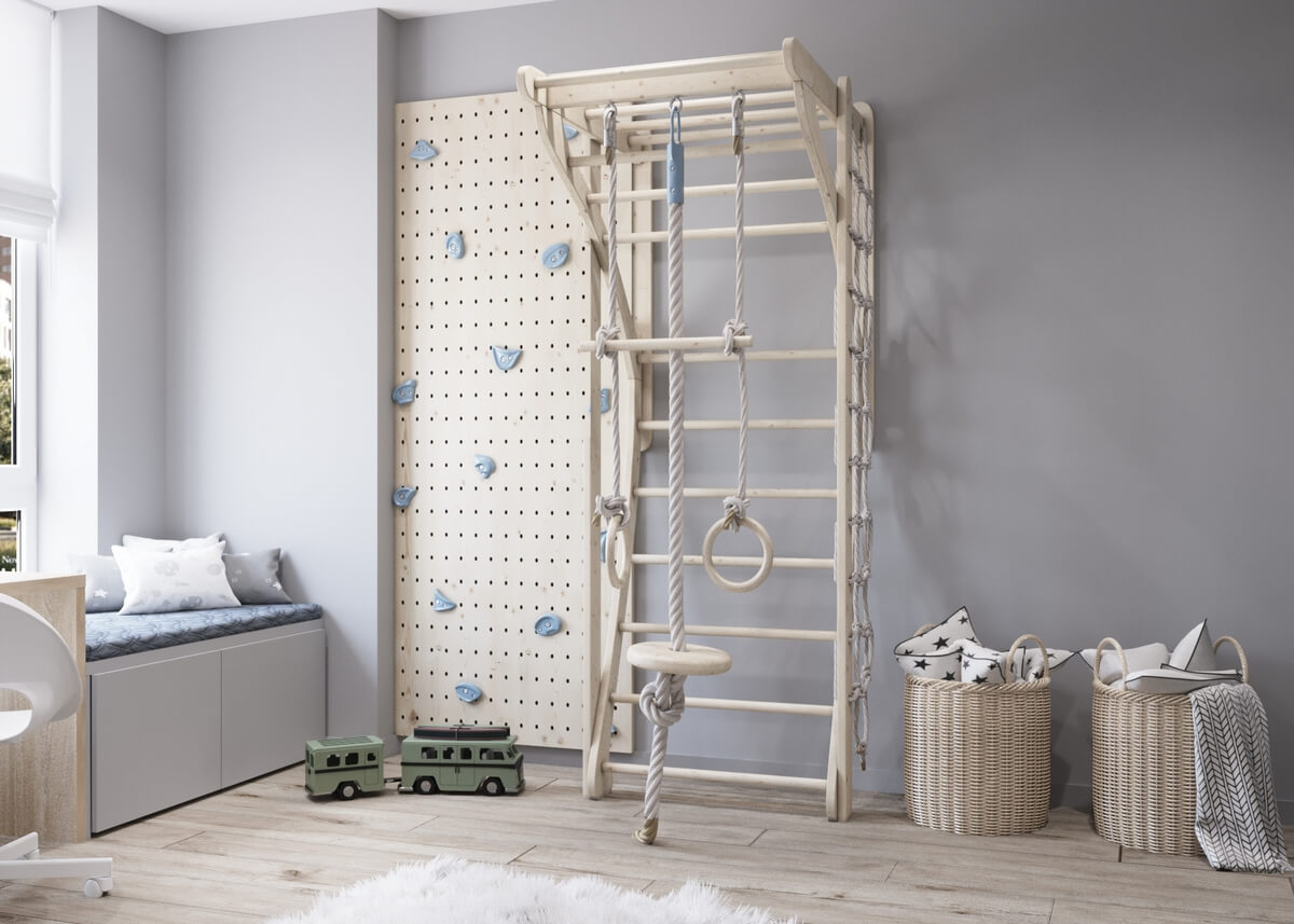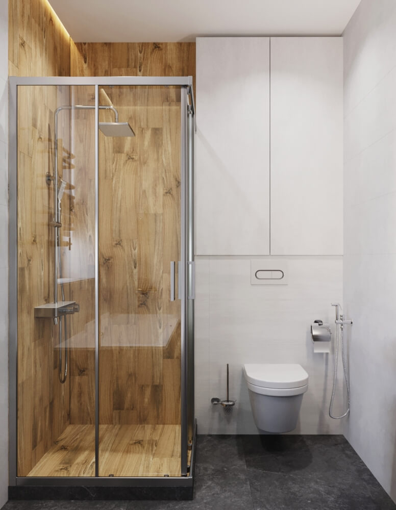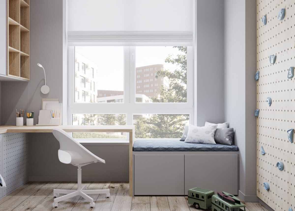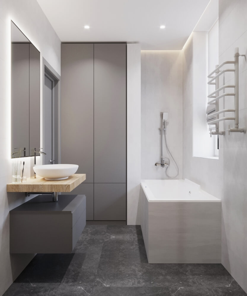 Невеликий передпокій оформлено у мінімалістичному стилі у сірих тонах, а для візуального розширення простору ми використали великі дзеркала. Кухня виконана у світлих тонах, а кухонних гарнітур – зі світлого необробленого дерева, що додає натуральності, природності інтер’єру і домашнього затишку. У дитячій кімнаті окремої уваги заслуговує ліжко, зроблене у ніші – таким чином дитина емоційно відчуває себе захищеною, а у кімнаті з’являється додаткове місце для зберігання речей. У дитячій кімнаті окрім зони для сну передбачено робочий куточок, де дитина зможе займатись навчанням, та ігрова. Також дерев’яні елементи використані у ванній кімнаті, це актуальний тренд сьогодні.