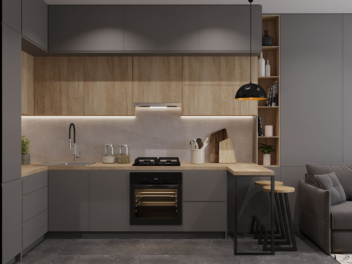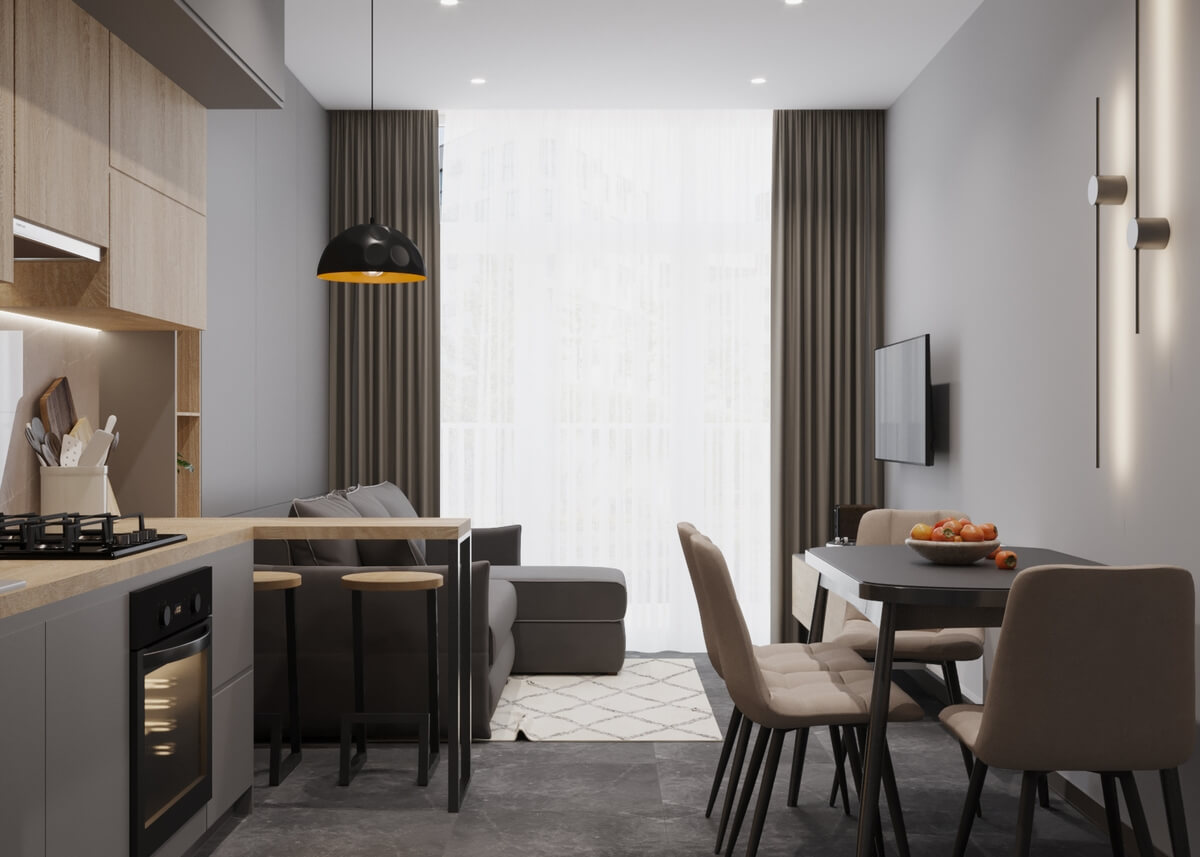 - Кухня частково виконує функції вітальні, у ній є куточок із м’якими меблями і великою плазмою. Навіть при невеликій площі створити зону для відпочинку не лише можливо, але й потрібно!